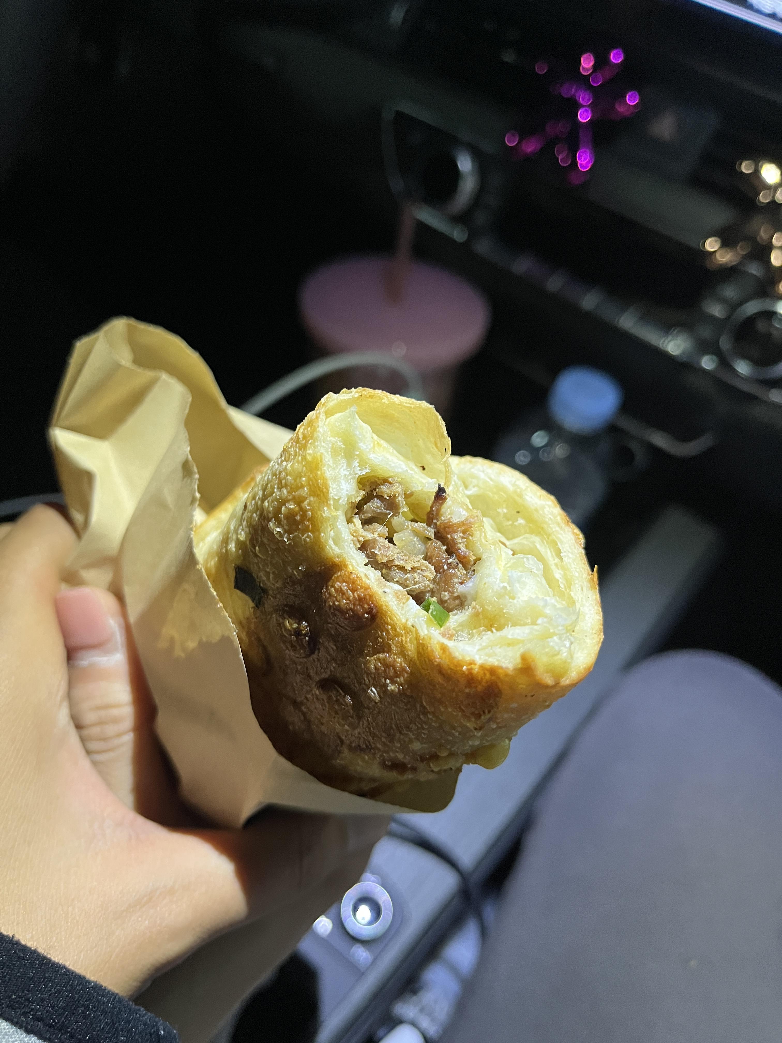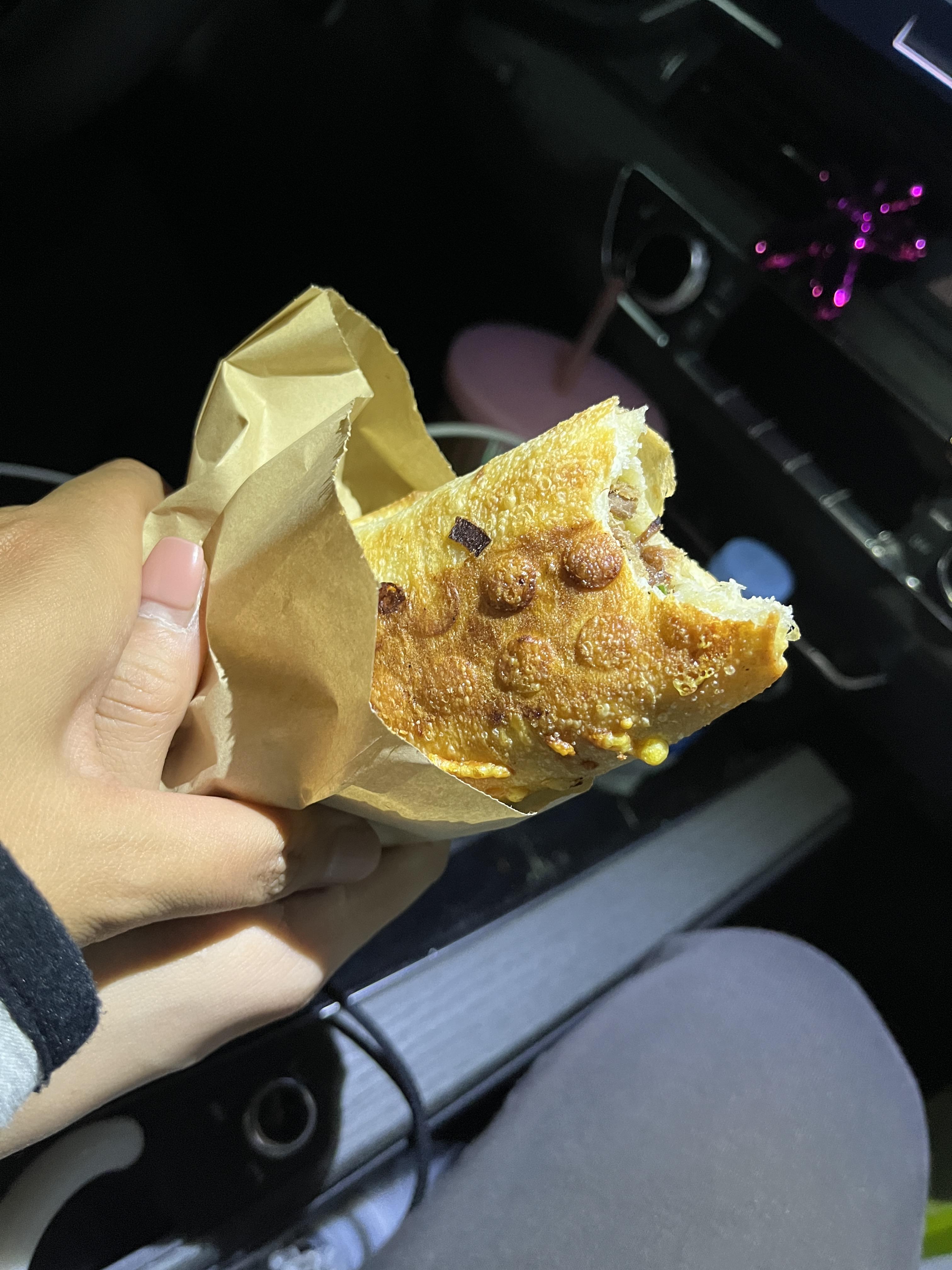 쇼핑을 마치고 친구 차에 앉아서 불고기 베이크를 나눠먹었습니다