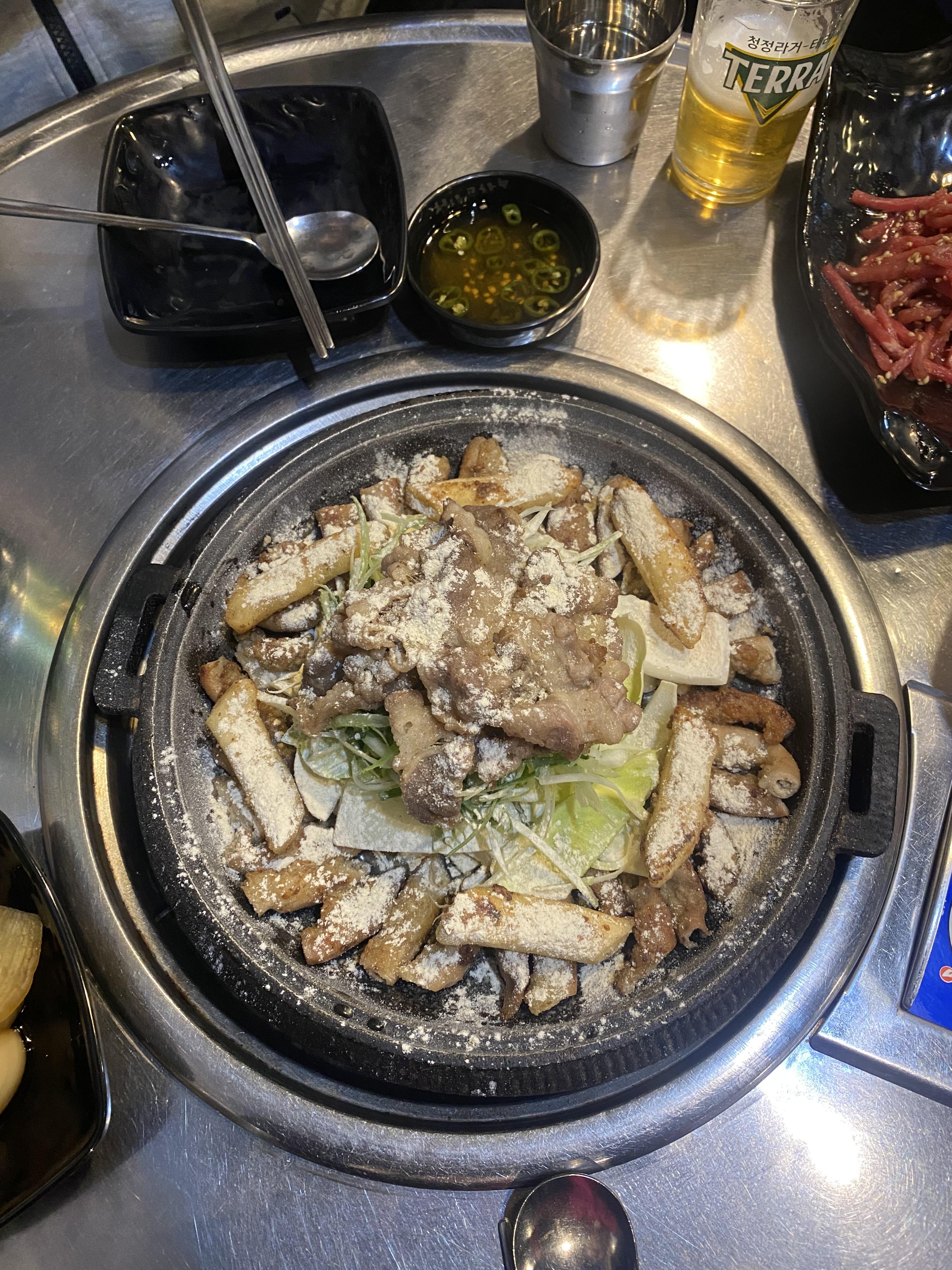 후라이팬에 먼저 곱창을 굽고 돌판에 주시더라고요. 그리고 마법의 흰가루를 숭덩 숭덩 뿌려주시는데.........