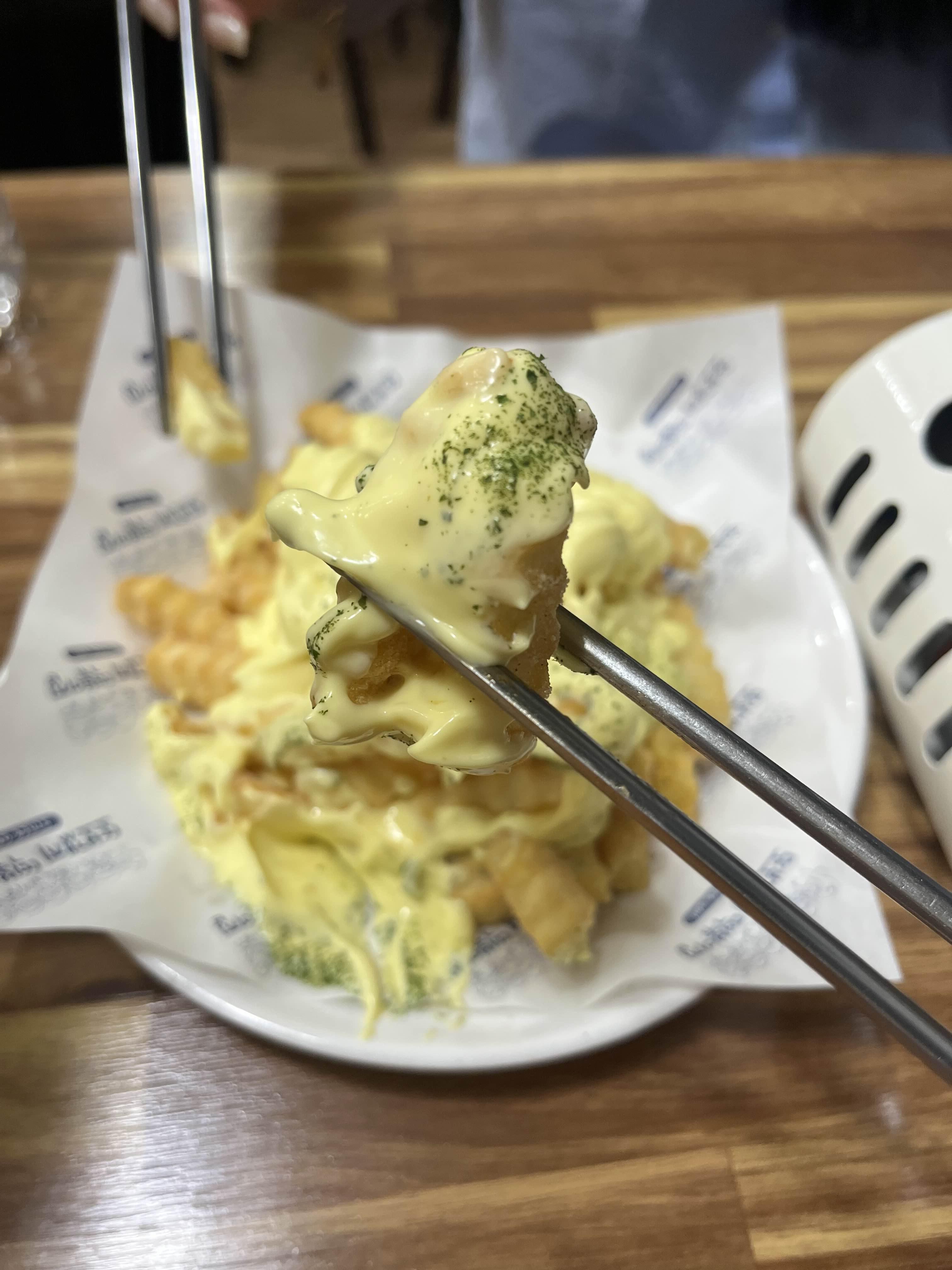 소스 듬뿍 얹은 버터갈릭 감자튀김이 나왔어요