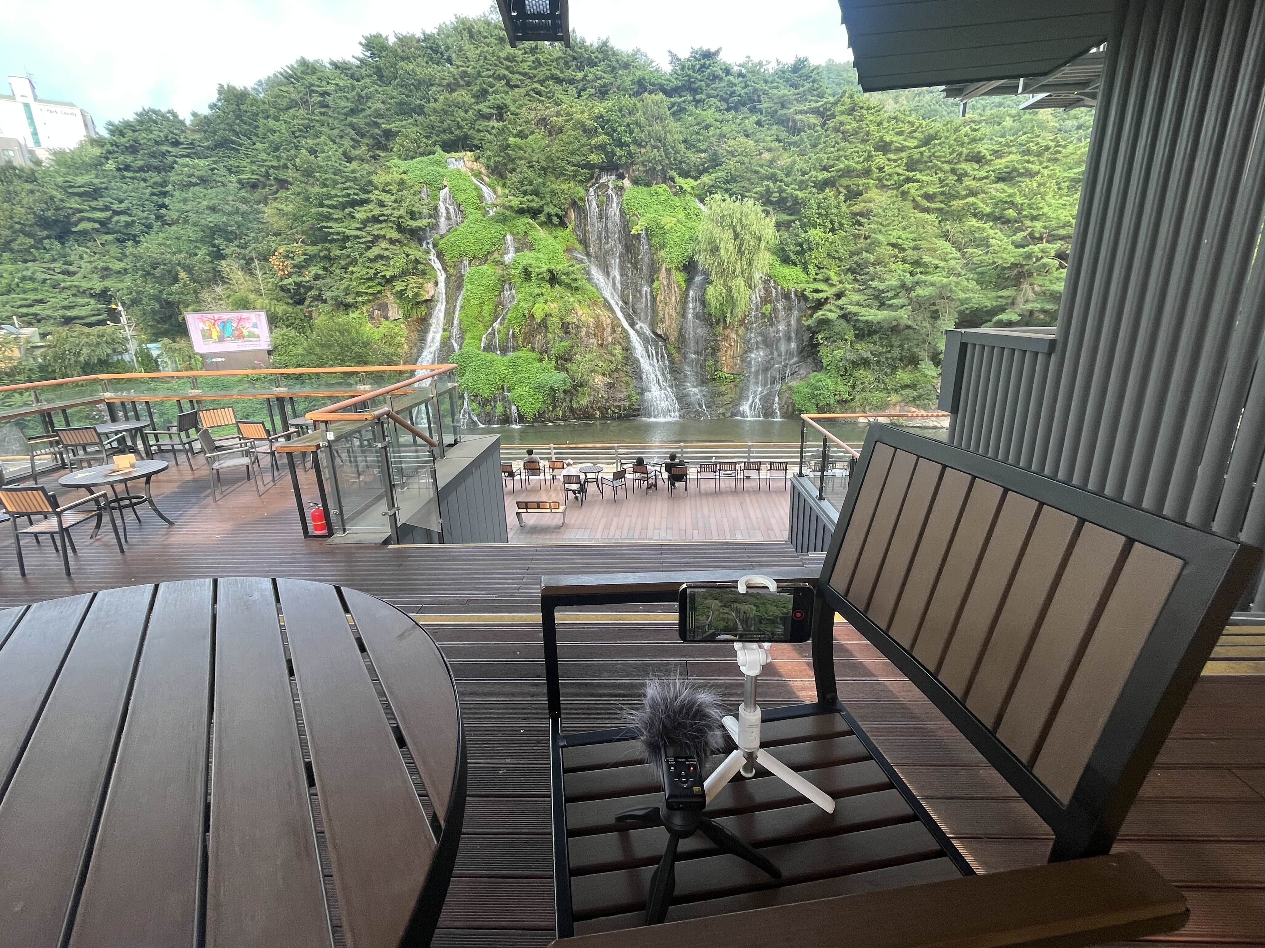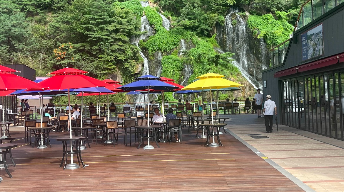 많은 분들이 폭포 앞에서 음료를 즐기고 계시더라고요